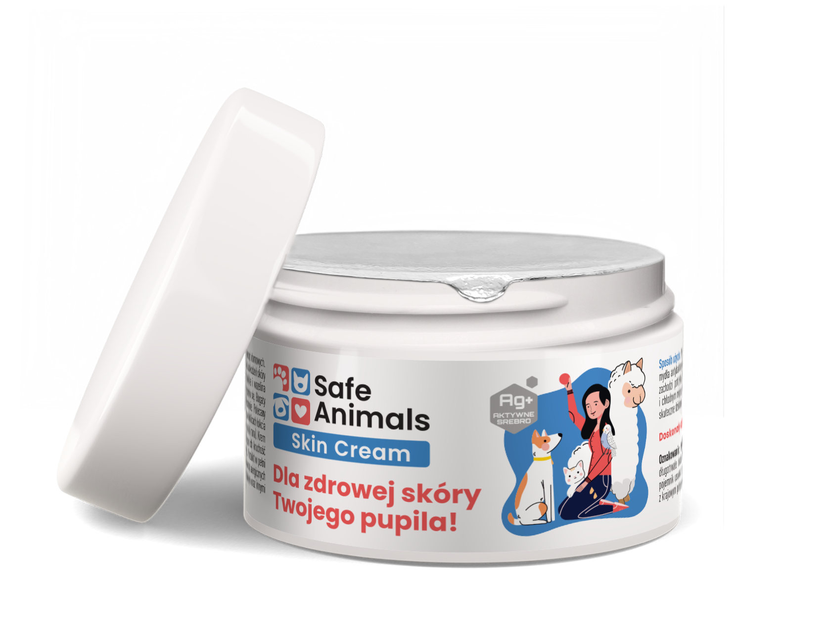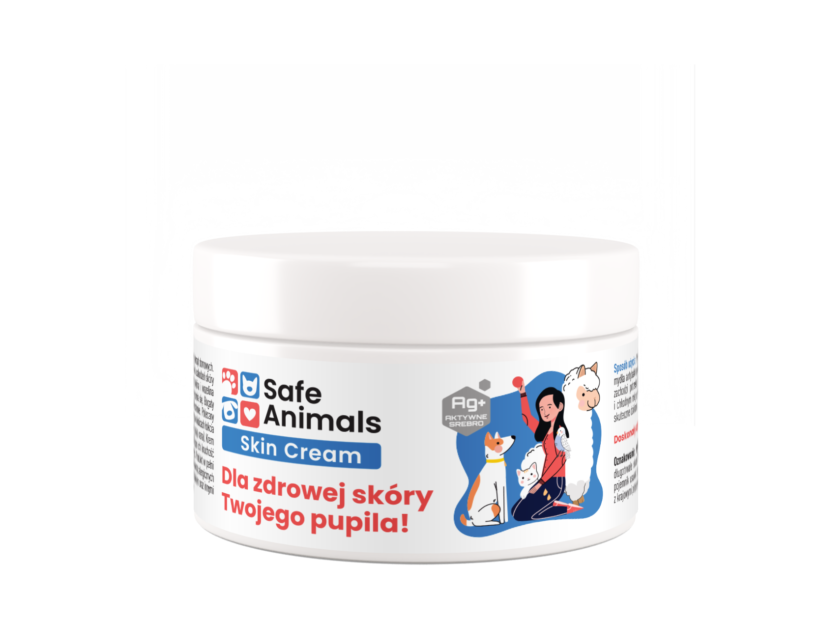 Safe Animals Skin Cream to idealny krem do pielęgnacji skóry zwierząt domowych. Zawarte w składzie aktywne formy srebra wspomagają gojenie się zmian i uszkodzeń skóry, zapewniając długotrwałą ochronę. Specjalnie dobrana w składzie lanolina i wazelina łagodzą podrażnienia suchej i popękanej skóry, eliminując efekt łuszczenia się. Bogaty skład kremu gwarantuje skuteczną regenerację skóry i jej uelastycznienie.